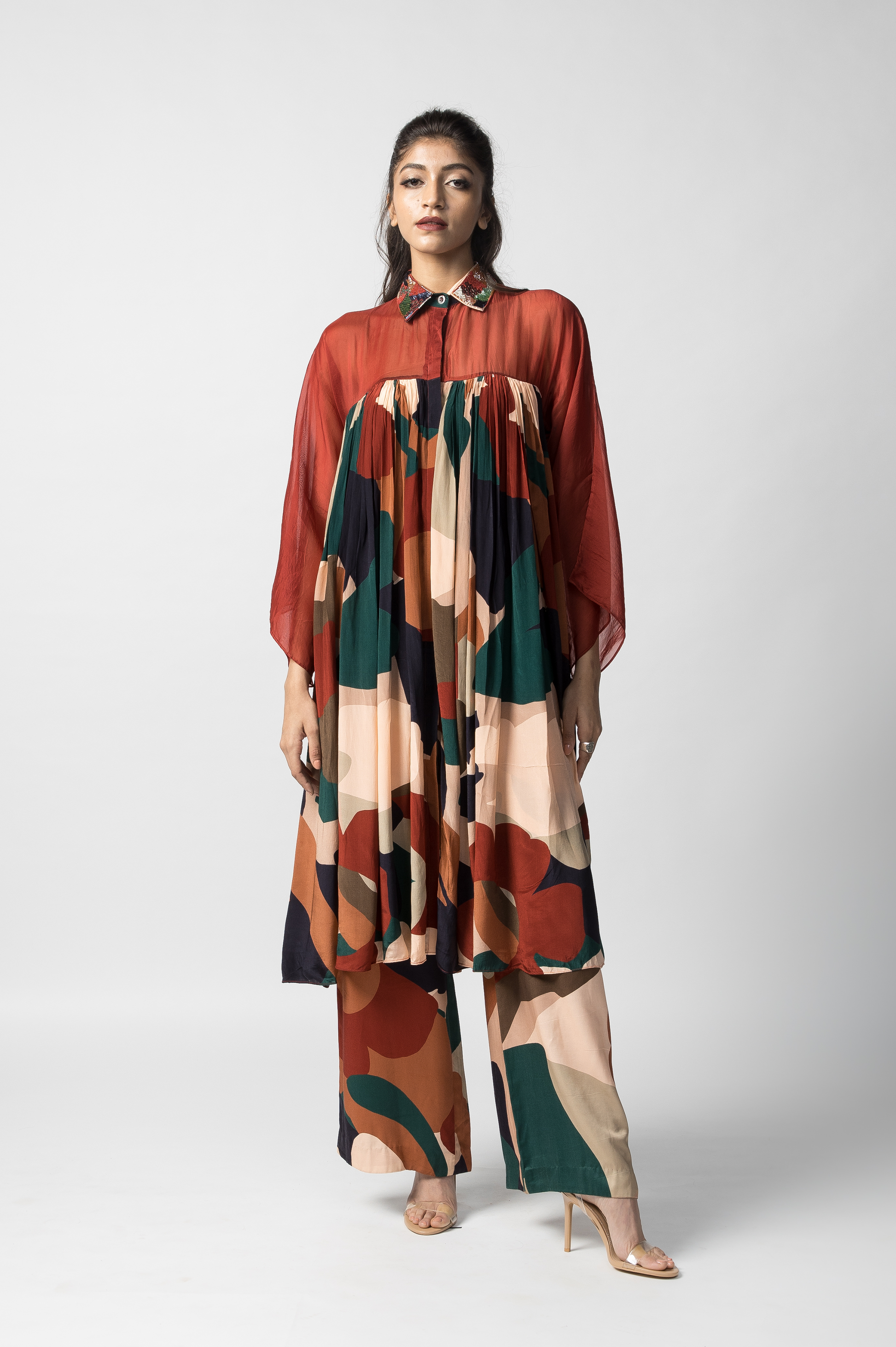 A pleated shirt dress with an organza panel and a hand embroidered collar paired with wide leg trousers.