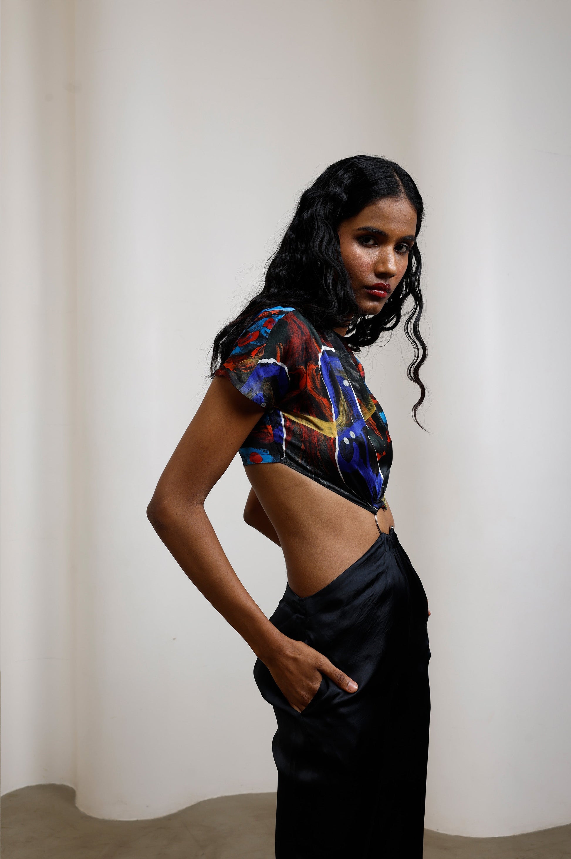 A cropped, short-sleeve top paired with high-waisted black trousers. The top is fitted and ends just below the bust, leaving the midriff exposed. It gathers into a small metal ring at the centre front, creating a cinched effect and a slight drape toward the sides. The trousers are black, straight-cut, and high-waisted, sitting above the waist.